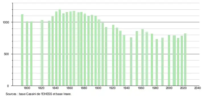 L'évolution du nombre d'habitants est connue à travers les recensements de la population effectués dans la commune depuis 1793. Pour les communes de moins de 10 000 habitants, une enquête de recensement portant sur toute la population est réalisée tous les cinq ans, les populations de référence des années intermédiaires étant quant à elles estimées par interpolation ou extrapolation[28]. Pour la commune, le premier recensement exhaustif entrant dans le cadre du nouveau dispositif a été réalisé en 2007[29].