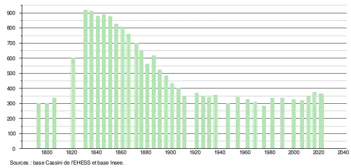 L'évolution du nombre d'habitants est connue à travers les recensements de la population effectués dans la commune depuis 1793. Pour les communes de moins de 10 000 habitants, une enquête de recensement portant sur toute la population est réalisée tous les cinq ans, les populations de référence des années intermédiaires étant quant à elles estimées par interpolation ou extrapolation[19]. Pour la commune, le premier recensement exhaustif entrant dans le cadre du nouveau dispositif a été réalisé en 2006[20].