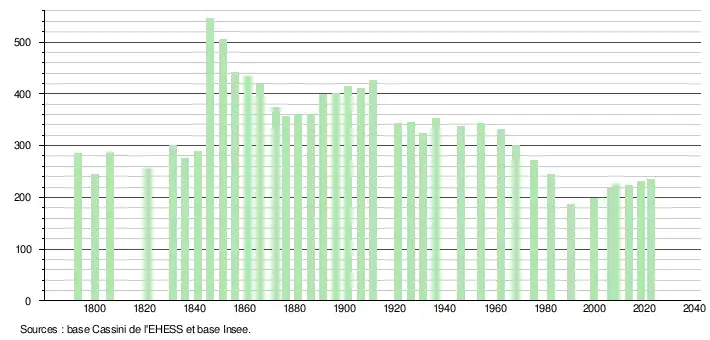 L'évolution du nombre d'habitants est connue à travers les recensements de la population effectués dans la commune depuis 1793. Pour les communes de moins de 10 000 habitants, une enquête de recensement portant sur toute la population est réalisée tous les cinq ans, les populations de référence des années intermédiaires étant quant à elles estimées par interpolation ou extrapolation[22]. Pour la commune, le premier recensement exhaustif entrant dans le cadre du nouveau dispositif a été réalisé en 2008[23].