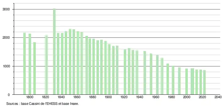 L'évolution du nombre d'habitants est connue à travers les recensements de la population effectués dans la commune depuis 1793. Pour les communes de moins de 10 000 habitants, une enquête de recensement portant sur toute la population est réalisée tous les cinq ans, les populations de référence des années intermédiaires étant quant à elles estimées par interpolation ou extrapolation[28]. Pour la commune, le premier recensement exhaustif entrant dans le cadre du nouveau dispositif a été réalisé en 2007[29].