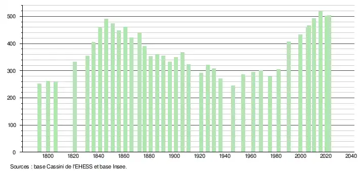 L'évolution du nombre d'habitants est connue à travers les recensements de la population effectués dans la commune depuis 1793. Pour les communes de moins de 10 000 habitants, une enquête de recensement portant sur toute la population est réalisée tous les cinq ans, les populations de référence des années intermédiaires étant quant à elles estimées par interpolation ou extrapolation[20]. Pour la commune, le premier recensement exhaustif entrant dans le cadre du nouveau dispositif a été réalisé en 2005[21].
