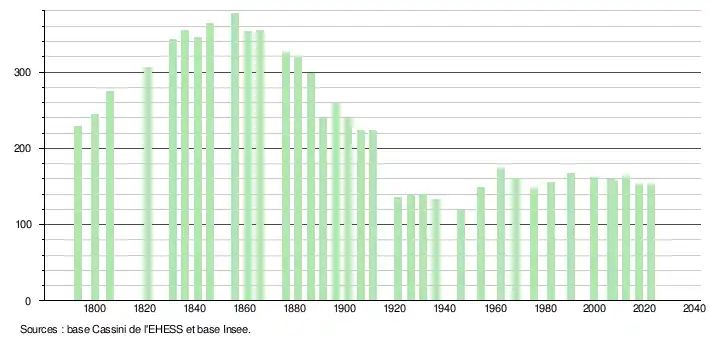 L'évolution du nombre d'habitants est connue à travers les recensements de la population effectués dans la commune depuis 1793. Pour les communes de moins de 10 000 habitants, une enquête de recensement portant sur toute la population est réalisée tous les cinq ans, les populations de référence des années intermédiaires étant quant à elles estimées par interpolation ou extrapolation[28]. Pour la commune, le premier recensement exhaustif entrant dans le cadre du nouveau dispositif a été réalisé en 2007[29].