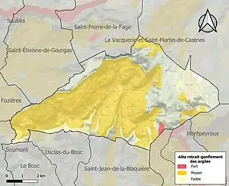 La commune est vulnérable au risque de mouvements de terrains constitué principalement du retrait-gonflement des sols argileux[27]. Cet aléa est susceptible d'engendrer des dommages importants aux bâtiments en cas d’alternance de périodes de sécheresse et de pluie. 60,7% de la superficie communale est en aléa moyen ou fort (59,3% au niveau départemental et 48,5% au niveau national). Sur les 284 bâtiments dénombrés sur la commune en 2019, 270 sont en aléa moyen ou fort, soit 95%, à comparer aux 85% au niveau départemental et 54% au niveau national. Une cartographie de l'exposition du territoire national au retrait gonflement des sols argileux est disponible sur le site du BRGM[28],[Carte 2].