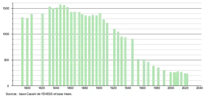 L'évolution du nombre d'habitants est connue à travers les recensements de la population effectués dans la commune depuis 1793. Pour les communes de moins de 10 000 habitants, une enquête de recensement portant sur toute la population est réalisée tous les cinq ans, les populations de référence des années intermédiaires étant quant à elles estimées par interpolation ou extrapolation[16]. Pour la commune, le premier recensement exhaustif entrant dans le cadre du nouveau dispositif a été réalisé en 2004[17].