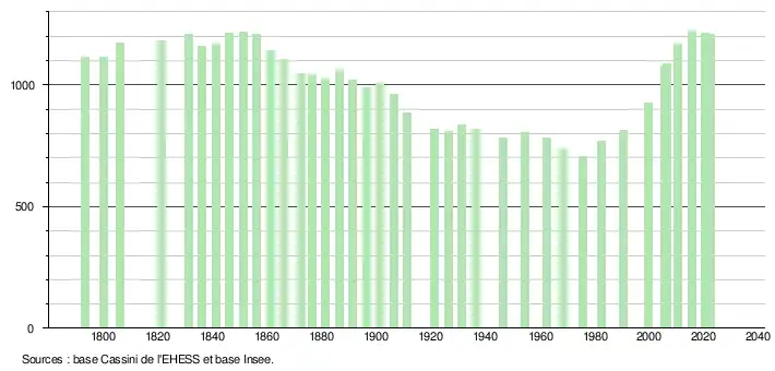 L'évolution du nombre d'habitants est connue à travers les recensements de la population effectués dans la commune depuis 1793. Pour les communes de moins de 10 000 habitants, une enquête de recensement portant sur toute la population est réalisée tous les cinq ans, les populations de référence des années intermédiaires étant quant à elles estimées par interpolation ou extrapolation[18]. Pour la commune, le premier recensement exhaustif entrant dans le cadre du nouveau dispositif a été réalisé en 2005[19].