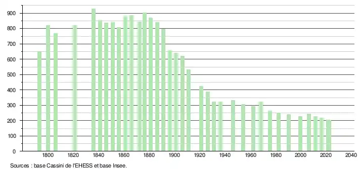 L'évolution du nombre d'habitants est connue à travers les recensements de la population effectués dans la commune depuis 1793. Pour les communes de moins de 10 000 habitants, une enquête de recensement portant sur toute la population est réalisée tous les cinq ans, les populations de référence des années intermédiaires étant quant à elles estimées par interpolation ou extrapolation[19]. Pour la commune, le premier recensement exhaustif entrant dans le cadre du nouveau dispositif a été réalisé en 2006[20].