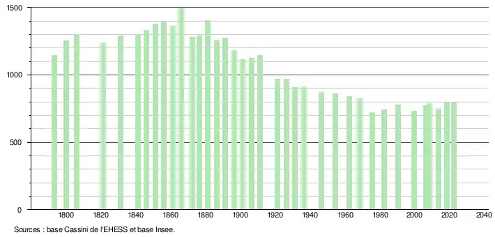 L'évolution du nombre d'habitants est connue à travers les recensements de la population effectués dans la commune depuis 1793. Pour les communes de moins de 10 000 habitants, une enquête de recensement portant sur toute la population est réalisée tous les cinq ans, les populations de référence des années intermédiaires étant quant à elles estimées par interpolation ou extrapolation[40]. Pour la commune, le premier recensement exhaustif entrant dans le cadre du nouveau dispositif a été réalisé en 2008[41].