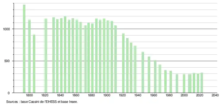 L'évolution du nombre d'habitants est connue à travers les recensements de la population effectués dans la commune depuis 1793. Pour les communes de moins de 10 000 habitants, une enquête de recensement portant sur toute la population est réalisée tous les cinq ans, les populations de référence des années intermédiaires étant quant à elles estimées par interpolation ou extrapolation[20]. Pour la commune, le premier recensement exhaustif entrant dans le cadre du nouveau dispositif a été réalisé en 2007[21].