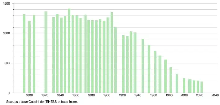 L'évolution du nombre d'habitants est connue à travers les recensements de la population effectués dans la commune depuis 1793. Pour les communes de moins de 10 000 habitants, une enquête de recensement portant sur toute la population est réalisée tous les cinq ans, les populations de référence des années intermédiaires étant quant à elles estimées par interpolation ou extrapolation[10]. Pour la commune, le premier recensement exhaustif entrant dans le cadre du nouveau dispositif a été réalisé en 2007[11].