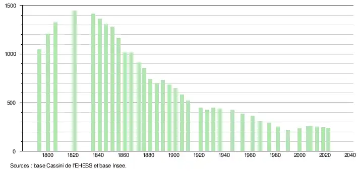 L'évolution du nombre d'habitants est connue à travers les recensements de la population effectués dans la commune depuis 1793. Pour les communes de moins de 10 000 habitants, une enquête de recensement portant sur toute la population est réalisée tous les cinq ans, les populations de référence des années intermédiaires étant quant à elles estimées par interpolation ou extrapolation[27]. Pour la commune, le premier recensement exhaustif entrant dans le cadre du nouveau dispositif a été réalisé en 2008[28].