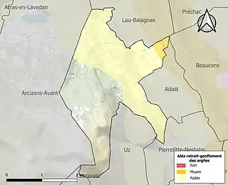 Le retrait-gonflement des sols argileux est susceptible d'engendrer des dommages importants aux bâtiments en cas d’alternance de périodes de sécheresse et de pluie. 2,2 % de la superficie communale est en aléa moyen ou fort (44,5 % au niveau départemental et 48,5 % au niveau national). Sur les 199 bâtiments dénombrés sur la commune en 2019, 5 sont en aléa moyen ou fort, soit 3 %, à comparer aux 75 % au niveau départemental et 54 % au niveau national. Une cartographie de l'exposition du territoire national au retrait gonflement des sols argileux est disponible sur le site du BRGM[35],[Carte 3].