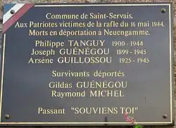 Le monument aux morts de Saint-Servais porte les noms de 15 personnes mortes pour la France pendant la Seconde Guerre mondiale; parmi ces victimes, Philippe Tanguy, résistant, déporté, mort le à Brême (Allemagne) ; Joseph Guénégou, résistant arrêté le lors d'une rafle à Servais en même temps que son fils, déporté au camp de concentration de Neuengamme et décédé le dans ce camp ; Arsène Guillossou, résistant déporté au stalag X-B et mort le au camp de Sandbostel[26].