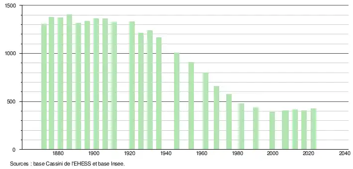 L'évolution du nombre d'habitants est connue à travers les recensements de la population effectués dans la commune depuis 1872. Pour les communes de moins de 10 000 habitants, une enquête de recensement portant sur toute la population est réalisée tous les cinq ans, les populations de référence des années intermédiaires étant quant à elles estimées par interpolation ou extrapolation[31]. Pour la commune, le premier recensement exhaustif entrant dans le cadre du nouveau dispositif a été réalisé en 2007[32].