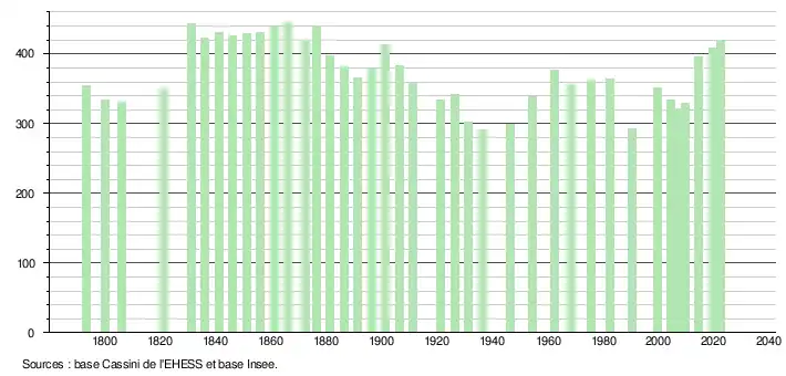 L'évolution du nombre d'habitants est connue à travers les recensements de la population effectués dans la commune depuis 1793. Pour les communes de moins de 10 000 habitants, une enquête de recensement portant sur toute la population est réalisée tous les cinq ans, les populations de référence des années intermédiaires étant quant à elles estimées par interpolation ou extrapolation[25]. Pour la commune, le premier recensement exhaustif entrant dans le cadre du nouveau dispositif a été réalisé en 2004[26].