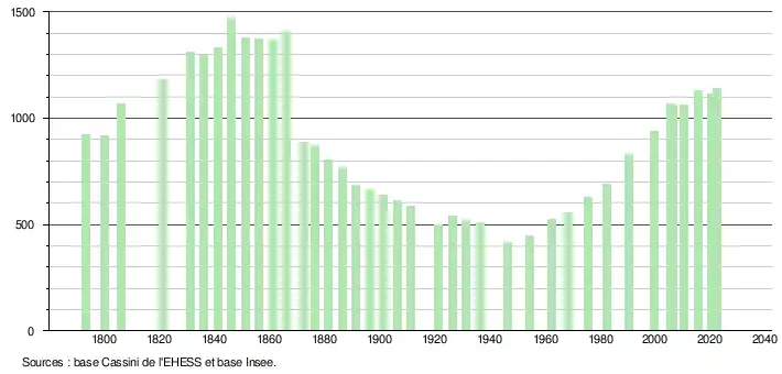 L'évolution du nombre d'habitants est connue à travers les recensements de la population effectués dans la commune depuis 1793. Pour les communes de moins de 10 000 habitants, une enquête de recensement portant sur toute la population est réalisée tous les cinq ans, les populations de référence des années intermédiaires étant quant à elles estimées par interpolation ou extrapolation[15]. Pour la commune, le premier recensement exhaustif entrant dans le cadre du nouveau dispositif a été réalisé en 2005[16].