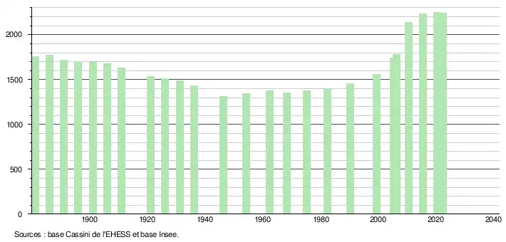 L'évolution du nombre d'habitants est connue à travers les recensements de la population effectués dans la commune depuis 1881. Pour les communes de moins de 10 000 habitants, une enquête de recensement portant sur toute la population est réalisée tous les cinq ans, les populations de référence des années intermédiaires étant quant à elles estimées par interpolation ou extrapolation[16]. Pour la commune, le premier recensement exhaustif entrant dans le cadre du nouveau dispositif a été réalisé en 2005[17].