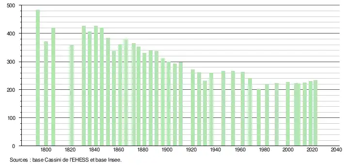 Ehess-Cassini donne pour l'année 1872 un total de population de 730; Ce chiffre de recensement paraît avoir été doublé. Il a été divisé par deux dans le tableau ci-dessus.
