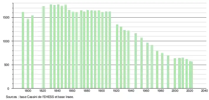 L'évolution du nombre d'habitants est connue à travers les recensements de la population effectués dans la commune depuis 1793. Pour les communes de moins de 10 000 habitants, une enquête de recensement portant sur toute la population est réalisée tous les cinq ans, les populations de référence des années intermédiaires étant quant à elles estimées par interpolation ou extrapolation[22]. Pour la commune, le premier recensement exhaustif entrant dans le cadre du nouveau dispositif a été réalisé en 2005[23].