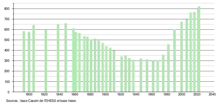 L'évolution du nombre d'habitants est connue à travers les recensements de la population effectués dans la commune depuis 1793. Pour les communes de moins de 10 000 habitants, une enquête de recensement portant sur toute la population est réalisée tous les cinq ans, les populations de référence des années intermédiaires étant quant à elles estimées par interpolation ou extrapolation[7]. Pour la commune, le premier recensement exhaustif entrant dans le cadre du nouveau dispositif a été réalisé en 2006[8].