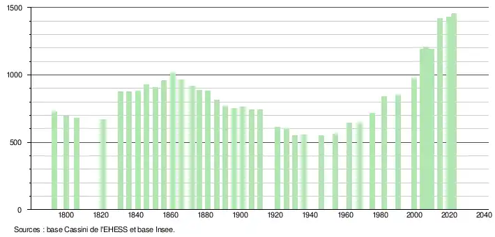 L'évolution du nombre d'habitants est connue à travers les recensements de la population effectués dans la commune depuis 1793. Pour les communes de moins de 10 000 habitants, une enquête de recensement portant sur toute la population est réalisée tous les cinq ans, les populations de référence des années intermédiaires étant quant à elles estimées par interpolation ou extrapolation[18]. Pour la commune, le premier recensement exhaustif entrant dans le cadre du nouveau dispositif a été réalisé en 2004[19].