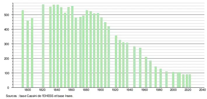 L'évolution du nombre d'habitants est connue à travers les recensements de la population effectués dans la commune depuis 1793. Pour les communes de moins de 10 000 habitants, une enquête de recensement portant sur toute la population est réalisée tous les cinq ans, les populations de référence des années intermédiaires étant quant à elles estimées par interpolation ou extrapolation[18]. Pour la commune, le premier recensement exhaustif entrant dans le cadre du nouveau dispositif a été réalisé en 2008[19].