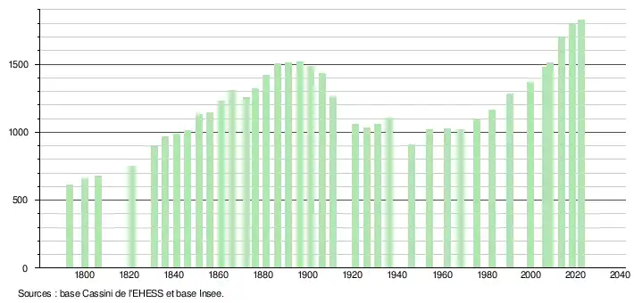 L'évolution du nombre d'habitants est connue à travers les recensements de la population effectués dans la commune depuis 1793. Pour les communes de moins de 10 000 habitants, une enquête de recensement portant sur toute la population est réalisée tous les cinq ans, les populations de référence des années intermédiaires étant quant à elles estimées par interpolation ou extrapolation[27]. Pour la commune, le premier recensement exhaustif entrant dans le cadre du nouveau dispositif a été réalisé en 2008[28].
