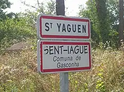 Il est à noter que le panneau d'entrée du village utilise une forme gasconne erronée, Sent-Iague, sans doute par une volonté d'hypercorrection et d'éloignement par rapport au nom francisé de la part du conseil municipal. Cette erreur est d'autant plus flagrante que le sous-titre, Comuna de Gasconha est correct. Dans tous les cas, l'orthographe du nom en gascon serait Sent Jàguen.