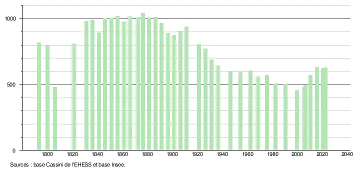 L'évolution du nombre d'habitants est connue à travers les recensements de la population effectués dans la commune depuis 1793. Pour les communes de moins de 10 000 habitants, une enquête de recensement portant sur toute la population est réalisée tous les cinq ans, les populations de référence des années intermédiaires étant quant à elles estimées par interpolation ou extrapolation[36]. Pour la commune, le premier recensement exhaustif entrant dans le cadre du nouveau dispositif a été réalisé en 2005[37].