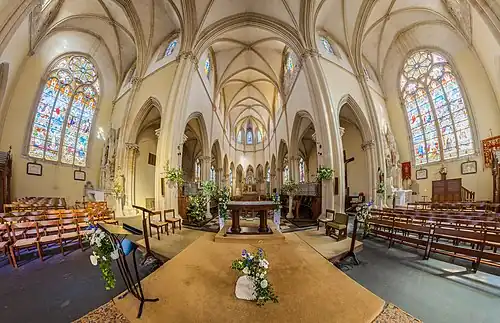 - ↑ « Ensemble de 17 verrières figurées : Vie du Christ, Vie de saint Martin, Saint Joseph, Vision de saint Aubert d'Avranches, Saint Augustin et sainte Monique, Sainte Jeanne d'Arc entendant les voix, la Femme de l'Apocalypse, Apparition de la Vierge à sainte Bernadette », notice no IM50002511.