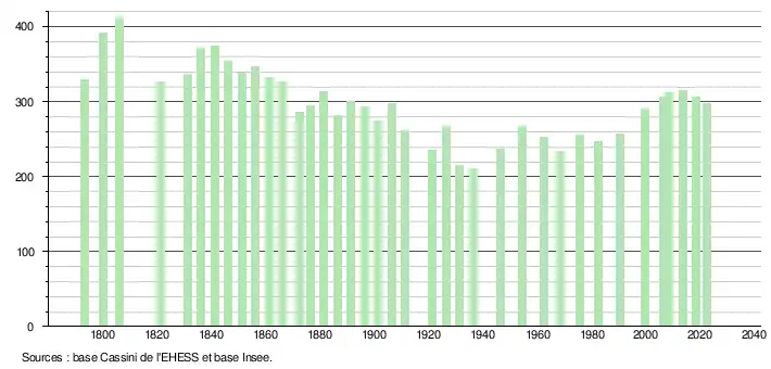 L'évolution du nombre d'habitants est connue à travers les recensements de la population effectués dans la commune depuis 1793. Pour les communes de moins de 10 000 habitants, une enquête de recensement portant sur toute la population est réalisée tous les cinq ans, les populations de référence des années intermédiaires étant quant à elles estimées par interpolation ou extrapolation[24]. Pour la commune, le premier recensement exhaustif entrant dans le cadre du nouveau dispositif a été réalisé en 2008[25].