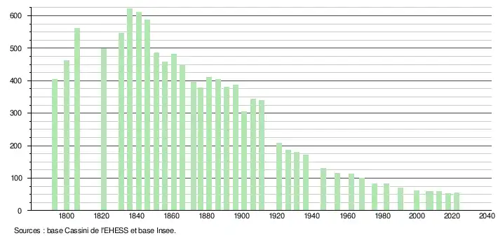 L'évolution du nombre d'habitants est connue à travers les recensements de la population effectués dans la commune depuis 1793. Pour les communes de moins de 10 000 habitants, une enquête de recensement portant sur toute la population est réalisée tous les cinq ans, les populations de référence des années intermédiaires étant quant à elles estimées par interpolation ou extrapolation[15]. Pour la commune, le premier recensement exhaustif entrant dans le cadre du nouveau dispositif a été réalisé en 2007[16].
