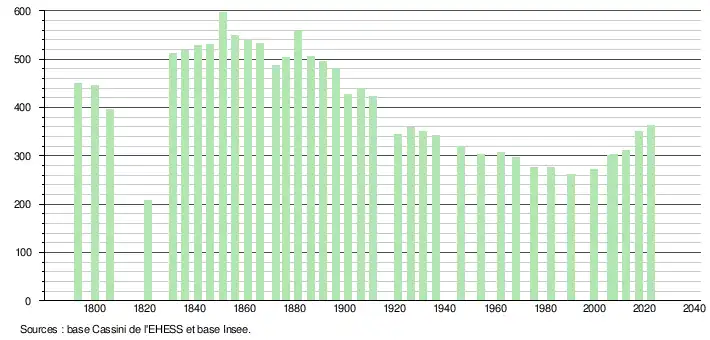 L'évolution du nombre d'habitants est connue à travers les recensements de la population effectués dans la commune depuis 1793. Pour les communes de moins de 10 000 habitants, une enquête de recensement portant sur toute la population est réalisée tous les cinq ans, les populations de référence des années intermédiaires étant quant à elles estimées par interpolation ou extrapolation[32]. Pour la commune, le premier recensement exhaustif entrant dans le cadre du nouveau dispositif a été réalisé en 2007[33].