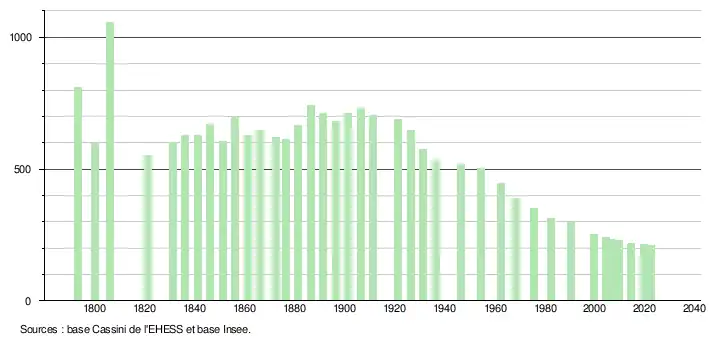 L'évolution du nombre d'habitants est connue à travers les recensements de la population effectués dans la commune depuis 1793. Pour les communes de moins de 10 000 habitants, une enquête de recensement portant sur toute la population est réalisée tous les cinq ans, les populations de référence des années intermédiaires étant quant à elles estimées par interpolation ou extrapolation[15]. Pour la commune, le premier recensement exhaustif entrant dans le cadre du nouveau dispositif a été réalisé en 2004[16].