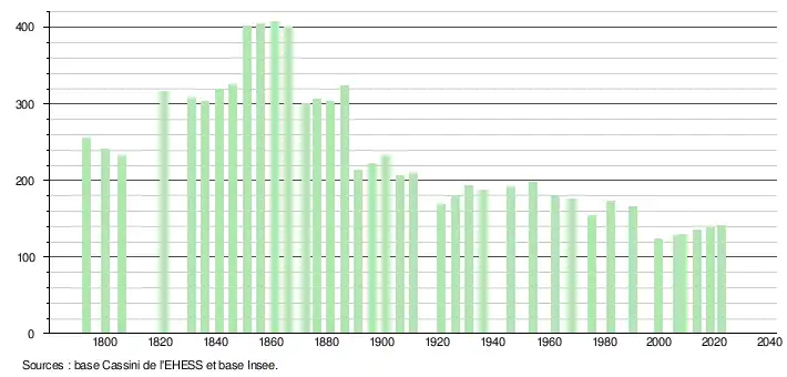 L'évolution du nombre d'habitants est connue à travers les recensements de la population effectués dans la commune depuis 1793. Pour les communes de moins de 10 000 habitants, une enquête de recensement portant sur toute la population est réalisée tous les cinq ans, les populations de référence des années intermédiaires étant quant à elles estimées par interpolation ou extrapolation[44]. Pour la commune, le premier recensement exhaustif entrant dans le cadre du nouveau dispositif a été réalisé en 2008[45].