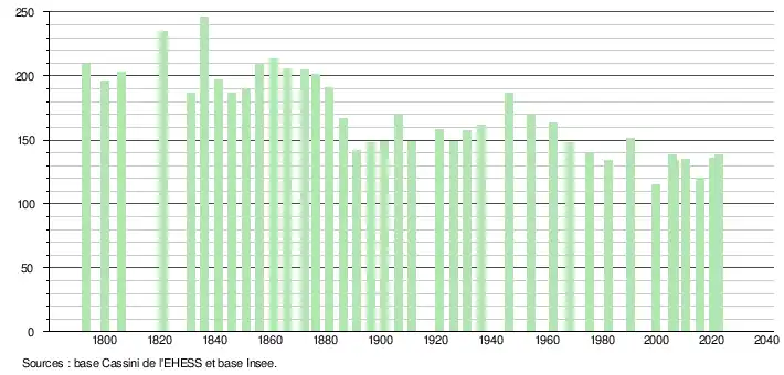 L'évolution du nombre d'habitants est connue à travers les recensements de la population effectués dans la commune depuis 1793. Pour les communes de moins de 10 000 habitants, une enquête de recensement portant sur toute la population est réalisée tous les cinq ans, les populations de référence des années intermédiaires étant quant à elles estimées par interpolation ou extrapolation[20]. Pour la commune, le premier recensement exhaustif entrant dans le cadre du nouveau dispositif a été réalisé en 2005[21].