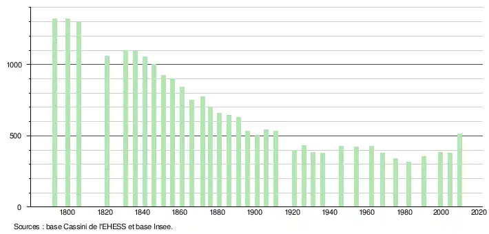 - ↑ Par convention dans Wikipédia, le principe a été retenu de n’afficher dans le tableau des recensements et le graphique, pour les populations légales postérieures à 1999, que les populations correspondant à une enquête exhaustive de recensement pour les communes de moins de 10 000 habitants, et que les populations des années 2006, 2011, 2016, etc. pour les communes de plus de 10 000 habitants, ainsi que la dernière population légale publiée par l’Insee pour l'ensemble des communes.