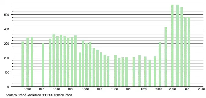 L'évolution du nombre d'habitants est connue à travers les recensements de la population effectués dans la commune depuis 1793. Pour les communes de moins de 10 000 habitants, une enquête de recensement portant sur toute la population est réalisée tous les cinq ans, les populations de référence des années intermédiaires étant quant à elles estimées par interpolation ou extrapolation[18]. Pour la commune, le premier recensement exhaustif entrant dans le cadre du nouveau dispositif a été réalisé en 2007[19].