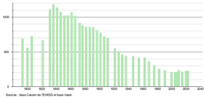 L'évolution du nombre d'habitants est connue à travers les recensements de la population effectués dans la commune depuis 1793. Pour les communes de moins de 10 000 habitants, une enquête de recensement portant sur toute la population est réalisée tous les cinq ans, les populations de référence des années intermédiaires étant quant à elles estimées par interpolation ou extrapolation[21]. Pour la commune, le premier recensement exhaustif entrant dans le cadre du nouveau dispositif a été réalisé en 2004[22].