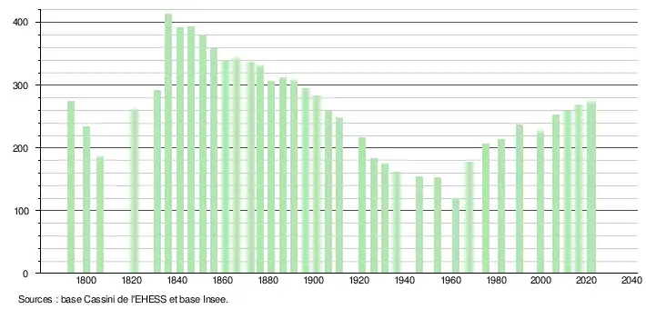 L'évolution du nombre d'habitants est connue à travers les recensements de la population effectués dans la commune depuis 1793. Pour les communes de moins de 10 000 habitants, une enquête de recensement portant sur toute la population est réalisée tous les cinq ans, les populations de référence des années intermédiaires étant quant à elles estimées par interpolation ou extrapolation[35]. Pour la commune, le premier recensement exhaustif entrant dans le cadre du nouveau dispositif a été réalisé en 2006[36].