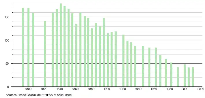 - ↑ Par convention dans Wikipédia, le principe a été retenu de n’afficher dans le tableau des recensements et le graphique, pour les populations légales postérieures à 1999, que les populations correspondant à une enquête exhaustive de recensement pour les communes de moins de 10 000 habitants, et que les populations des années 2006, 2011, 2016, etc. pour les communes de plus de 10 000 habitants, ainsi que la dernière population légale publiée par l’Insee pour l'ensemble des communes.