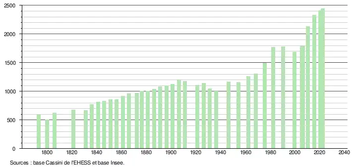L'évolution du nombre d'habitants est connue à travers les recensements de la population effectués dans la commune depuis 1793. Pour les communes de moins de 10 000 habitants, une enquête de recensement portant sur toute la population est réalisée tous les cinq ans, les populations de référence des années intermédiaires étant quant à elles estimées par interpolation ou extrapolation[16]. Pour la commune, le premier recensement exhaustif entrant dans le cadre du nouveau dispositif a été réalisé en 2005[17].