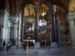 Les deux grandes jarres de marbre (ou d'onyx) appartiennent à la période hellénistique. Ces énormes vases monolithes furent rapportés de Pergame durant le règne du sultan Mourad III. La porte de bronze marquant l'entrée latérale dans le narthex au sud-ouest, dite la « belle porte » (Güzel Kapı), provient d'un temple grec, probablement de la ville de Tarsus.
