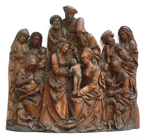 Antependium, Heilige Sippe (1490/1500), Strasbourg, maintenant Musée des arts appliqués (Francfort). On lit de gauche à droite : Maria Salomé, Jacobus, Zebedeus, S. Johannes, Maria, (Jésus n'est pas nommé) Joseph, Joachim, S. Anna, Alpheus, Joseph, Simon, Jude, Cleobas, Maria Cleoba, puis tout à droite : Memelia, Eimyn, S. Cerruaci (Servais), S. Johannes Battista, S. Elisabeth et Zacharias.