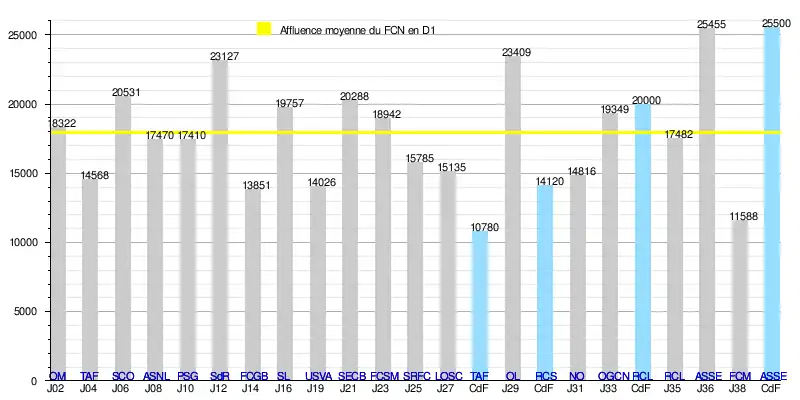 - de 411 211 spectateurs en 23 rencontres toutes compétitions confondues, soit une moyenne de 17 879/match.