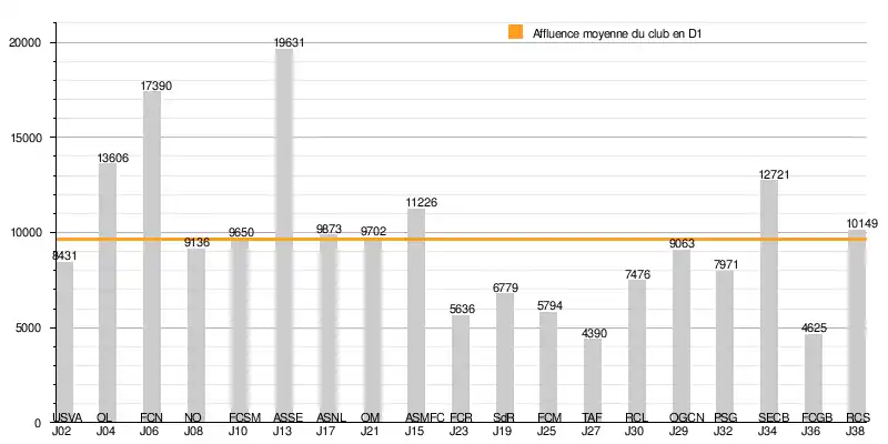 L'affluence à domicile du Stade lavallois atteint un total de 183 249 spectateurs en 19 rencontres de Division 1, soit une moyenne de 9 645/match.