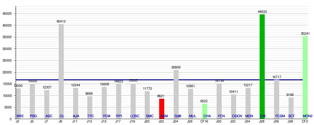 En championnat uniquement, la moyenne est de 16 340 sur les 19 rencontres avec 310 467 spectateurs