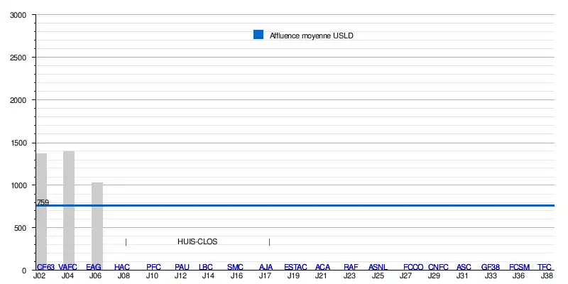 - de 3 793 spectateurs en 5 rencontre de Ligue 2 (dont 2 à huis clos), soit une moyenne de 759/match.