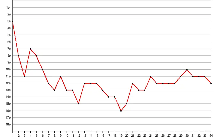 12e 41 points (13V, 2N, 19D) 51 buts pour, 50 buts contre |
