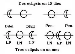 Une saison d'éclipses dure entre 31 et 37 jours, durant laquelle il se produit au moins 2 éclipses (de Lune et de Soleil). Et il peut se produire jusqu'à 3 éclipses : 2 de Lune ou de Soleil, « encadrant » une éclipse de type opposé (de Lune ou de Soleil), dont celle-ci se produit vers le milieu de la saison d'éclipses.