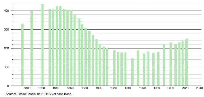 L'évolution du nombre d'habitants est connue à travers les recensements de la population effectués dans la commune depuis 1793. Pour les communes de moins de 10 000 habitants, une enquête de recensement portant sur toute la population est réalisée tous les cinq ans, les populations de référence des années intermédiaires étant quant à elles estimées par interpolation ou extrapolation[26]. Pour la commune, le premier recensement exhaustif entrant dans le cadre du nouveau dispositif a été réalisé en 2006[27].